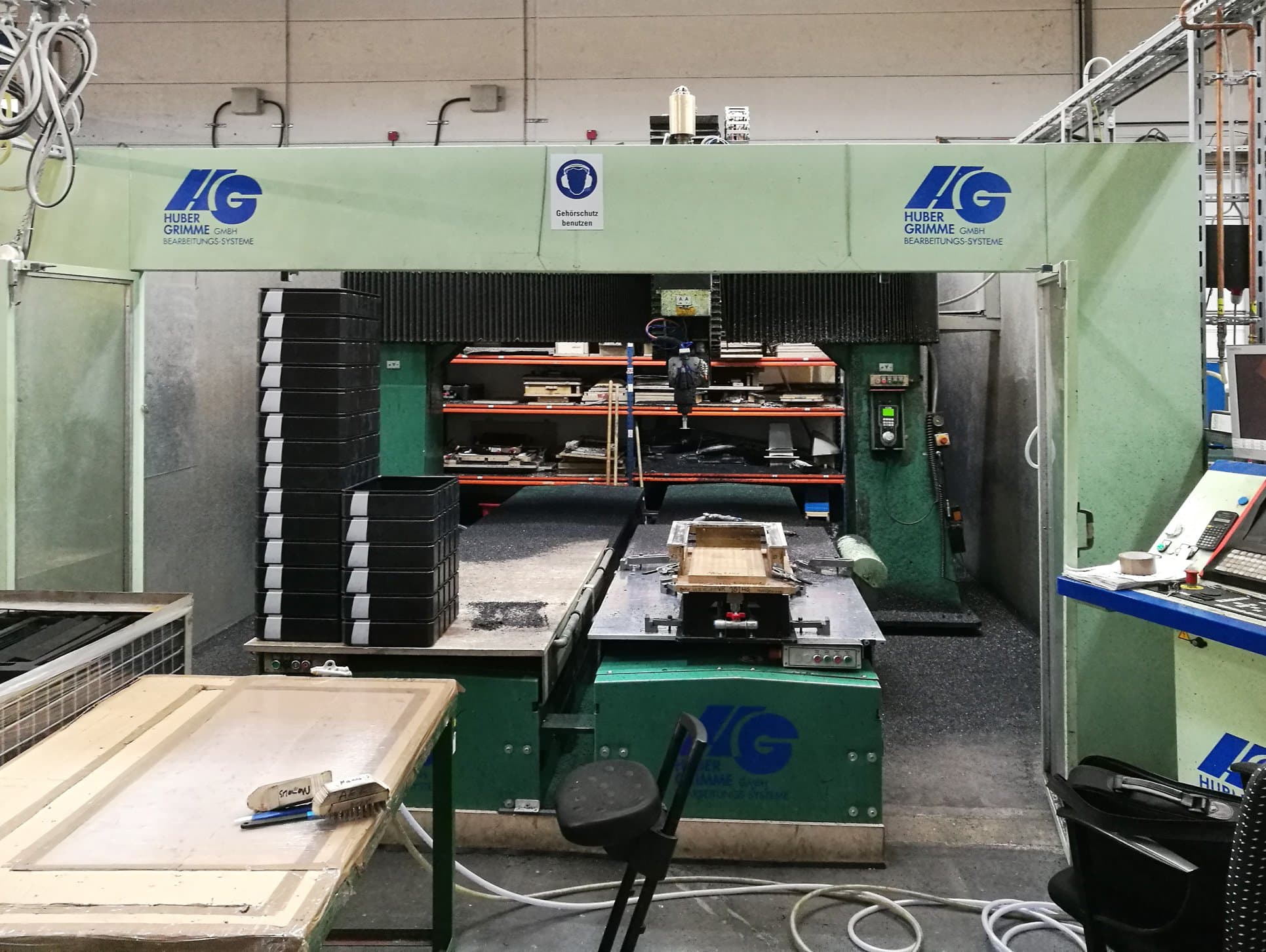 Cette fraiseuse Huber&Grimme HG3000T a été fabriquée en 1997 en Allemagne et compte depuis 27905 heures de production. Commandée par une unité de contrôle NUM 1062W, cette machine de construction solide se distingue par sa gamme de mouvements et ses deux tables de travail. Dans le passé, cette Huber&Grimme a traité principalement du plastique d'une épaisseur allant jusqu'à 4 mm. Plusieurs équipements supplémentaires sont inclus, tels que : une pompe à vide pour les tables, un boîtier, une unité de refroidissement de la broche et un porte-outil 6x.